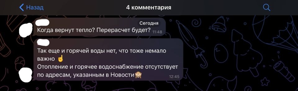 «Так еще и горячей воды нет, что тоже немало важно. Отопление и горячее водоснабжение отсутствуют по адресам, указанным в новости».