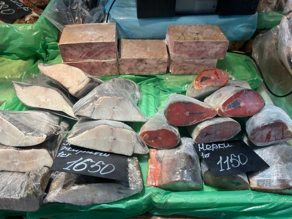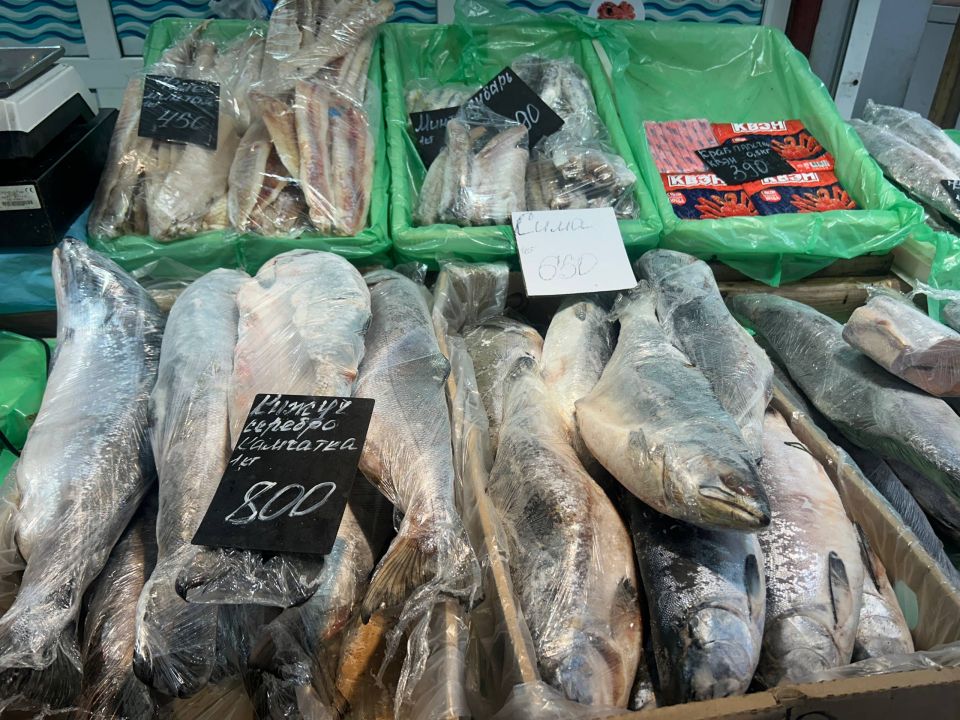 Красная рыба, как и ожидалось, самая дорогая. Килограмм нерки стоит от 1150 до 1200 рублей. Чавычу продают по частям: за килограмм от головы – 1550 рублей, от хвоста – 1500 рублей, а от середины – 1600 рублей. Но можно найти и по 1250 рублей. За форель просят от 1450 до 1500 рублей. Кета стоит от 250 до 790 рублей, сима – от 450 до 650 рублей, кижуч – от 800 до 850 рублей, горбуша – от 300 до 350 рублей.