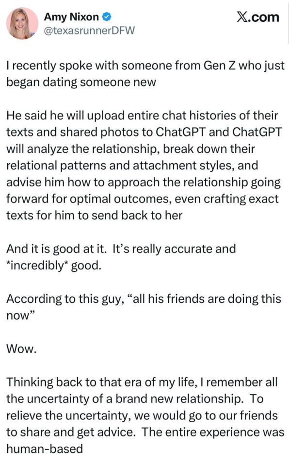 «Недавно я общалась с представителем поколения Z, который только начал встречаться. Он сказал, что загружает всю историю их переписки в ChatGPT и анализирует отношения, разбирает их модели поведения и стили привязанности, а также советует ему, как строить отношения в будущем для достижения оптимальных результатов. По словам этого парня, «все его друзья теперь так делают».