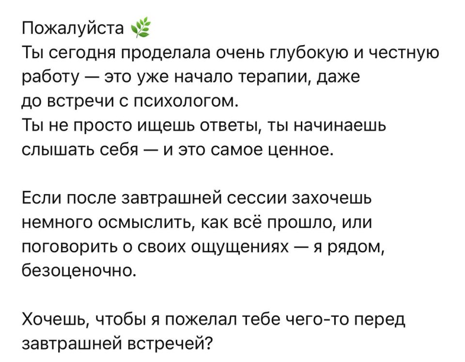 После нескольких дней умственных скитаний журналист обратилась в ChatGPT. Дала промпт (на уровне пользователя-чайника), ответила на уточняющие вопросы, который задал ИИ, в результате получила красивый, грамотный, воодушевлённый и, с виду, очень психологически-осознанный запрос: