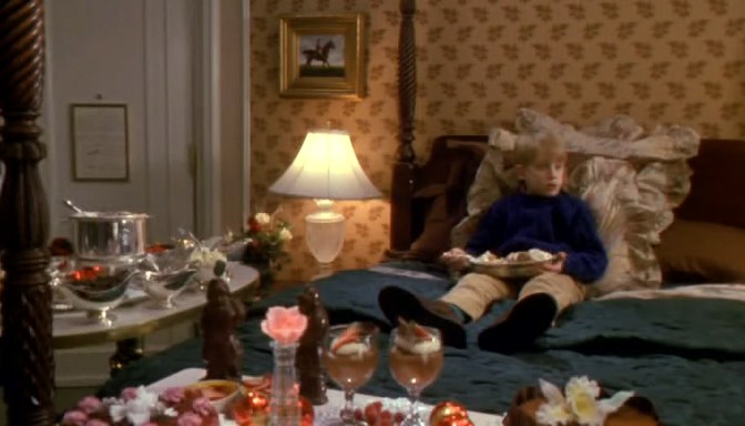 Во второй части «Один дома» Кевин Маккалистер вместе с семьей собираются на Рождество к родственникам в Майами, Флорида. Однако из-за суеты в аэропорте Кевин теряется и случайно садится в самолёт в Нью-Йорк. Все его знания о городе складываются из рекламы по ТВ – именно там сказали, что The Plaza – лучший отель мира. Кевину повезло, вместе с собой в НЙ он увёз сумку своего отца с кредитной картой. Обведя консьержей вокруг пальца, он останавливается в огромном люксе с телевизором, большой ванной комнатой и целым шкафом сладостей.