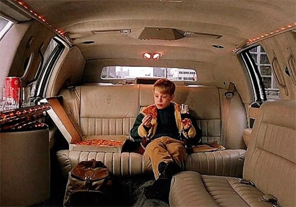 Эта часть фильма застряла в памяти каждого: Кевин выходит из отеля, а на улице его ждёт роскошный лимузин, консьерж держит пиццу, а водитель устраивает Кевину экскурсию по всему Нью-Йорку. Они ездят по всем знаковым местам «столицы мира»: Empire State Building, Рокфеллеровский центр, Хадсон-Ярдс (район на западе боро Манхэттен), в магазин игрушек (такого магазина в реальности нет). В лимузине Кевин смотрит культовый мультфильм «Гринч: похититель Рождества», ест пиццу и пьёт кока-колу.