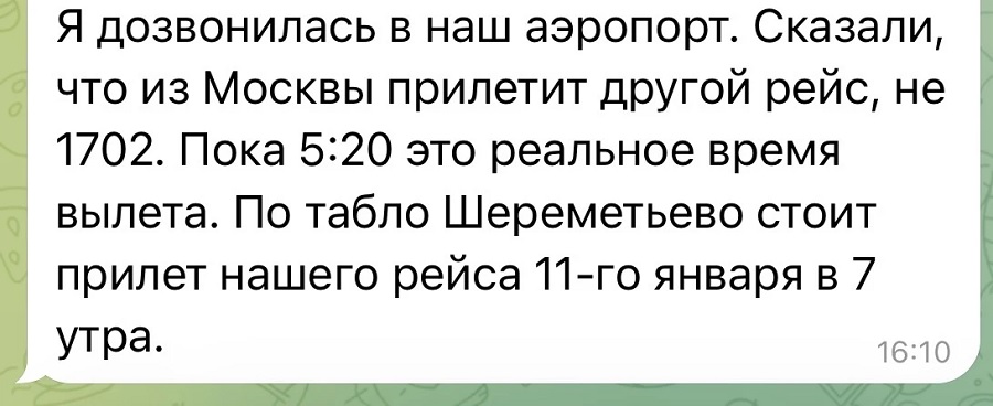 В число отменённых рейсов попал вчерашний рейс SU-1702 из Москвы во Владивосток. Пассажиры получают соответствующие СМС. Обратный рейс SU-1703, который был перенесён сначала сегодня на 13:50, а затем на 00:50 воскресенья, 11 января, теперь предполагается к вылету на 05:20 воскресенья. Всего, как сообщается, отправления в Москву ожидают более 700 пассажиров, которые делятся информацией друг с другом.