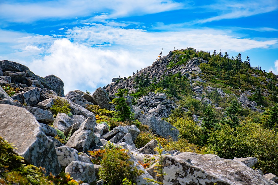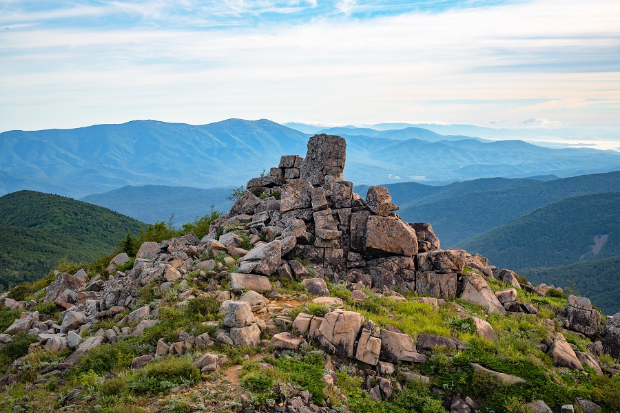 Вершина представляет собой скальный гребень, сложенный причудливыми гранитными останцами. Эти скалы, похожие на спины гигантских динозавров или крепостные стены, создают уникальный ландшафт, который никого не оставляет равнодушным.