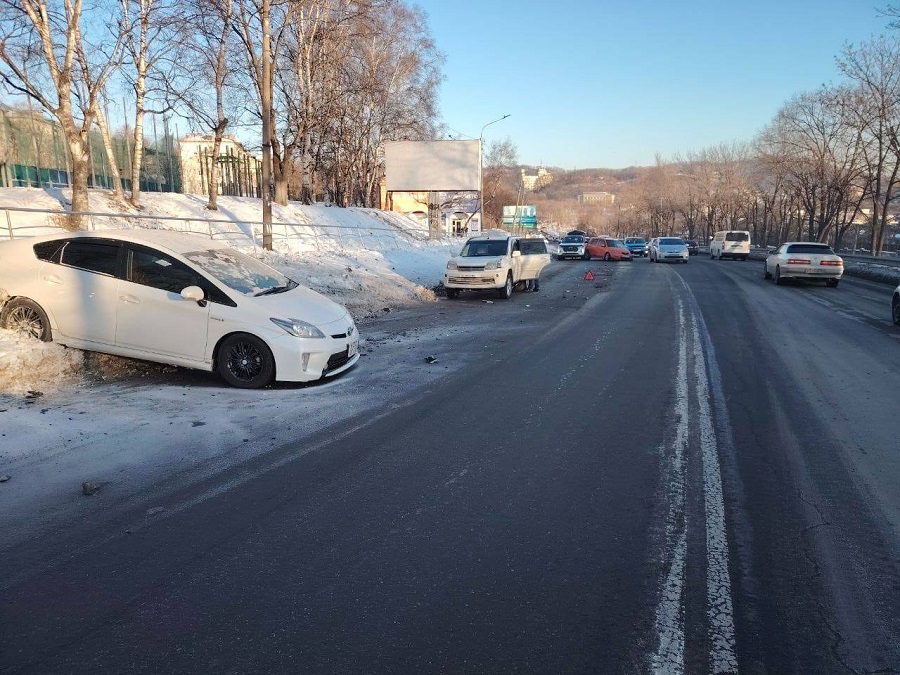 В районе дома № 58 на Находкинском проспекте водитель Mazda Demio, двигаясь от Рыбного порта, не справился с управлением, вылетел на встречную полосу и врезался в ехавший рядом Toyota Prius. Удар был такой силы, что у «приуса» оторвало переднее колесо. Оно в свою очередь влетело в соседний Nissan X-Trail. Финалом поездки для лихача стало столкновение с Chery Tiggo.