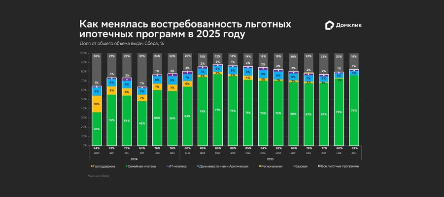 Динамика объёмов выдач по льготным программам по РФ за 2024-2025 гг. (данные Сбера). Динамика доли выдач по программе «Господдержка» показана жёлтым, по «Семейной ипотеке» – зелёным, по IT-ипотеке – фиолетовым, по «Дальневосточной и Арктической» – голубым, выдачи на общих (базовых) условиях показаны серым. Числовые значения показаны для случаев, когда значения превышают 1%. Данные по «Региональной ипотеке» по большинству месяцев не приводятся, поскольку доля выдач не превышает 1%.