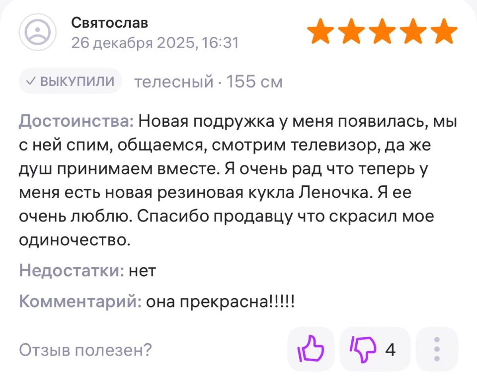Некоторые мужчины всерьёз воспринимают кукол как компаньонов. Например, Святослав гордо заявляет, что его «Леночка» — полноценная подружка: вместе спят, смотрят телевизор и даже принимают душ. «Спасибо продавцу за то, что помог скрасить одиночество», — искренне благодарит он в отзыве. А таксист Сергей нашёл в кукле идеальную спутницу: «Денег не просит, нервы не треплет».