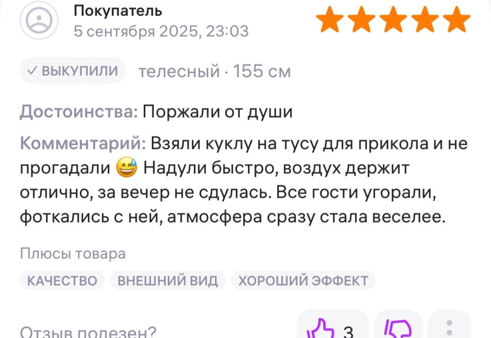 Другие видят в кукле отличный способ развеселить гостей. Один из покупателей хвастается: «Скрасит любую вечеринку! Все насмеялись, атмосфера стала веселее». Действительно, представить компанию друзей, фотографирующихся с куклой в бассейне вместо надувного круга, — уже повод для улыбки.