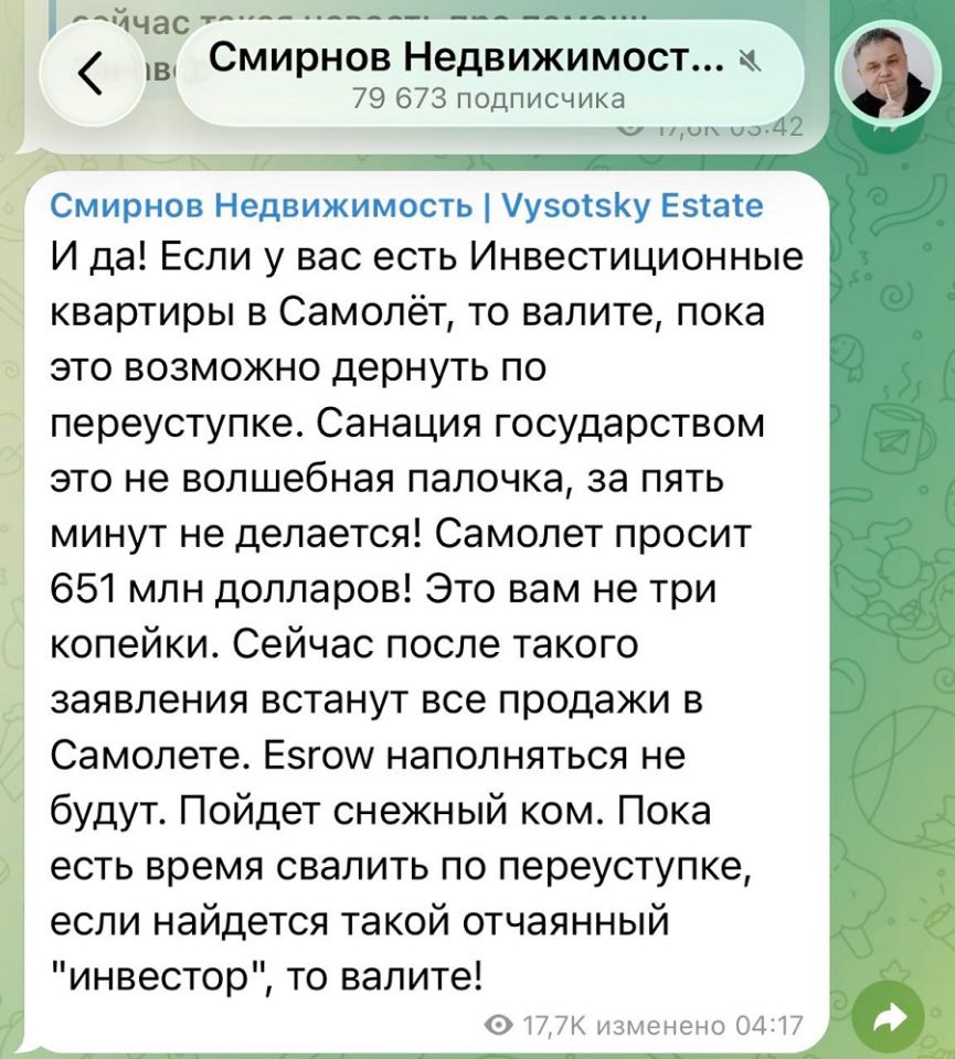 «Самое главное для рынка недвижимости в том, что Самолёт везде позиционировал себя целый год как компанию №1. Возникает вопрос! Если в компании №1 с вполне вменяемой структурой менеджмента и биржевой отчётностью такие проблемы, что мы можем ожидать от компаний №11 или №15 (совпадения случайны). Объёмы продаваемых лотов Самолёта в течение недели просто перестанут покупать. Другие застройщики в моменте могут получить переток денег на свои лоты… Господина Мишустина поставили перед непростым выбором: помочь Самолёту и открыть прецедент, когда другие застройщики тоже начнут писать письма и просить помощь, не помочь Самолёту означает разгребать проблемы с Банками и дольщиками. Оба решения плохие… «Аналитики» стали писать чушь в стиле «компания Самолёт слишком большая, чтобы ей дали упасть». На это менеджмент Самолёта и рассчитывает, применяя шантаж. НО НЕТ! Не тот год выбрали. Дадут упасть в назидание всей отрасли еще и с Бастрыкиным! Посадят весь менеджмент, чтобы остальным неповадно было!» — эмоционально пишет у себя в Telegram-канале Известный эксперт по недвижимости и старший партнёр риелторской компании Vysotsky Estate Сергей Смирнов.