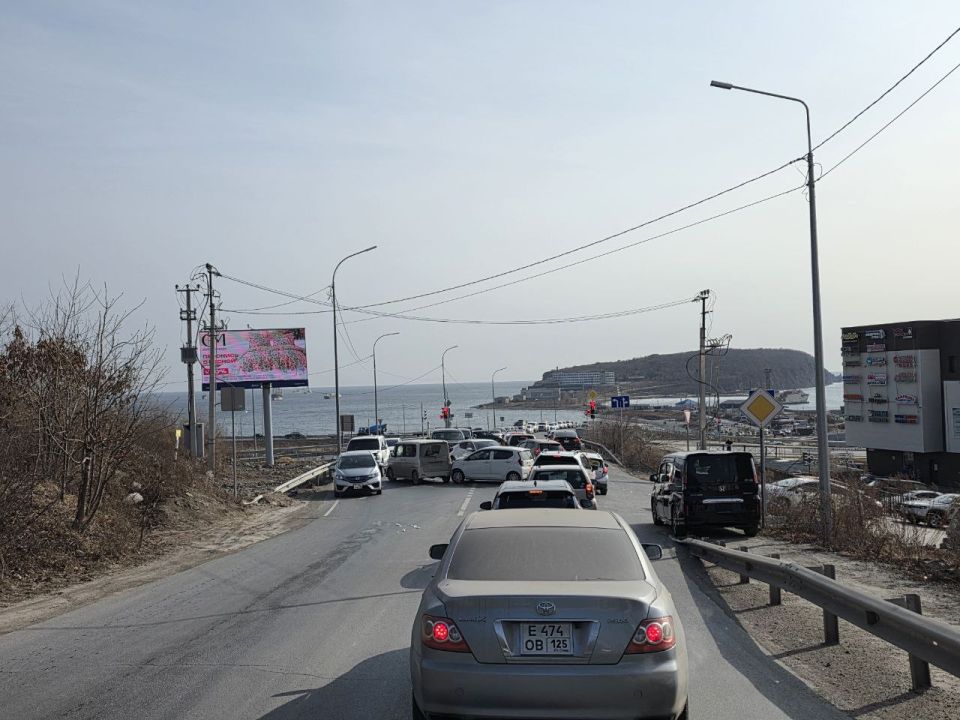 Со стороны Чуркина в направлении Золотого моста. «Сузуки Джимни», судя по всему, отвлекся и врезался в грузовик. Собралась уже огромная пробка, проехать невозможно.