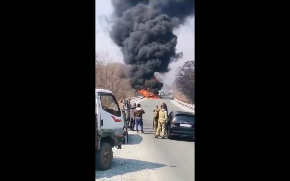 Автомобиль сгорел дотла на трассе в Хасанском районе. Из-за происшествия дорога полностью перекрыта, сообщает PRIMPRESS.