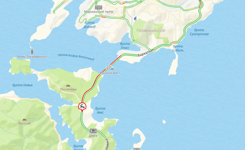 Главная причина затора – ремонт теплосетей в районе мини-ТЭЦ «Центральная». Из-за этого участок дороги перекрыт, а движение организовано по реверсивной схеме. Сейчас машины в сторону острова пропускают по одной полосе, чередуя потоки.