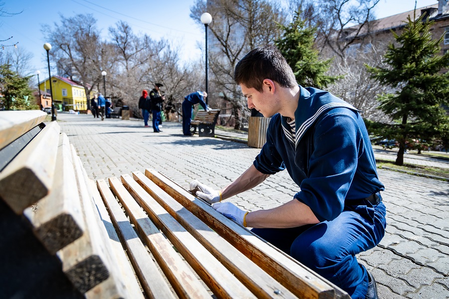 В Сквере юнг на Бестужева собрались около 80 человек. Помимо сотрудников Транспортной группы, на субботник вышли курсанты МГУ Невельского и школьники — учащиеся Морских классов FESCO. Сквер привели в порядок после зимы: убрали старые листья и траву, подмели дорожки, покрасили бордюры, обработали деревья от паразитов и залакировали лавочки.