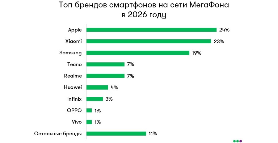 Доля смартфонов Apple среди устройств, зарегистрированных в мобильной сети МегаФона, в 2026 году достигла 24%, сместив с первого места Xiaomi. В топе устройств по-прежнему остается iPhone 11. Среди Android-брендов уверенно растет популярность Tecno.