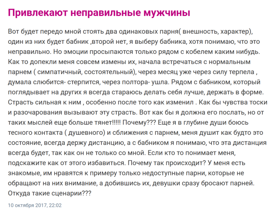 В выпавших темах авторКи высказывали свои недовольства, спрашивали, что делать, если привлекают мужчины старше или «неправильные» мужчины, а также просто интересовались мнением других девушек на темы, связанные с привлекательными чертами в мужчинах. Автор выделил несколько основных пунктов, которые чаще всего обсуждали девушки, и, главное, с которыми они чаще всего соглашались.