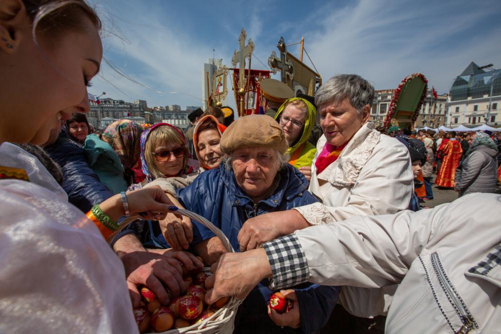Во Владивостоке прошли основные мероприятия празднования Пасхи. С 12:00 до 13:00 состоялся крестный ход от собора Покрова Пресвятой Богородицы до центральной площади.